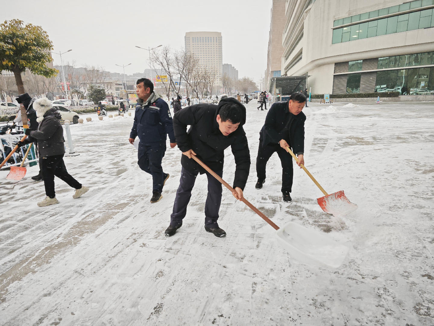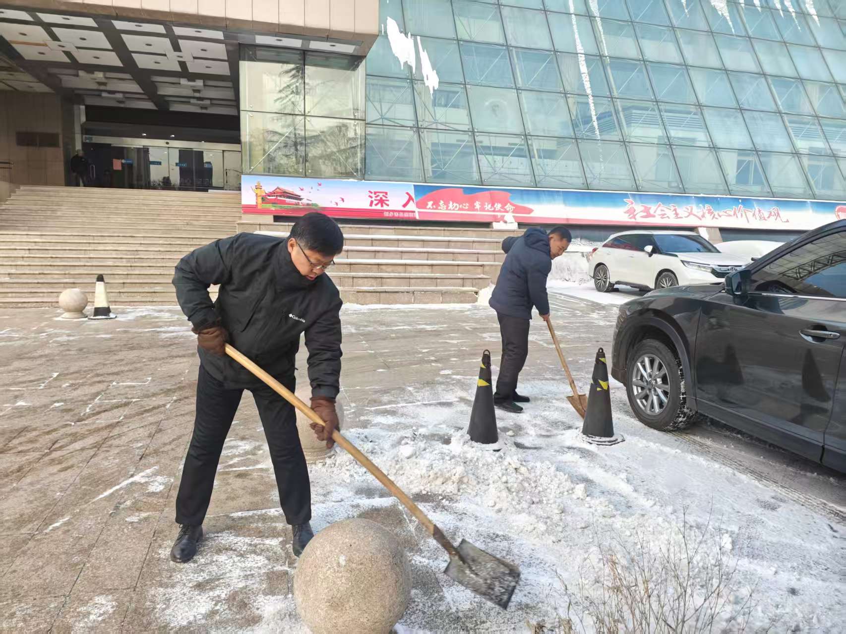 雪情就是命令,1月20日,天刚蒙蒙亮,寒意还没散,机关办公区已被积雪盖得严严实实,路面结冰湿滑难行。市政府副秘书长,市机关事务中心党组书记、主任张付银带头,中心各党组成员也积极行动,身着御寒衣物,手持铁锹、扫帚,与各科室集结成扫雪队伍,毅然投身到清雪除冰一线,用实际行动为大家开辟“安全通道”。